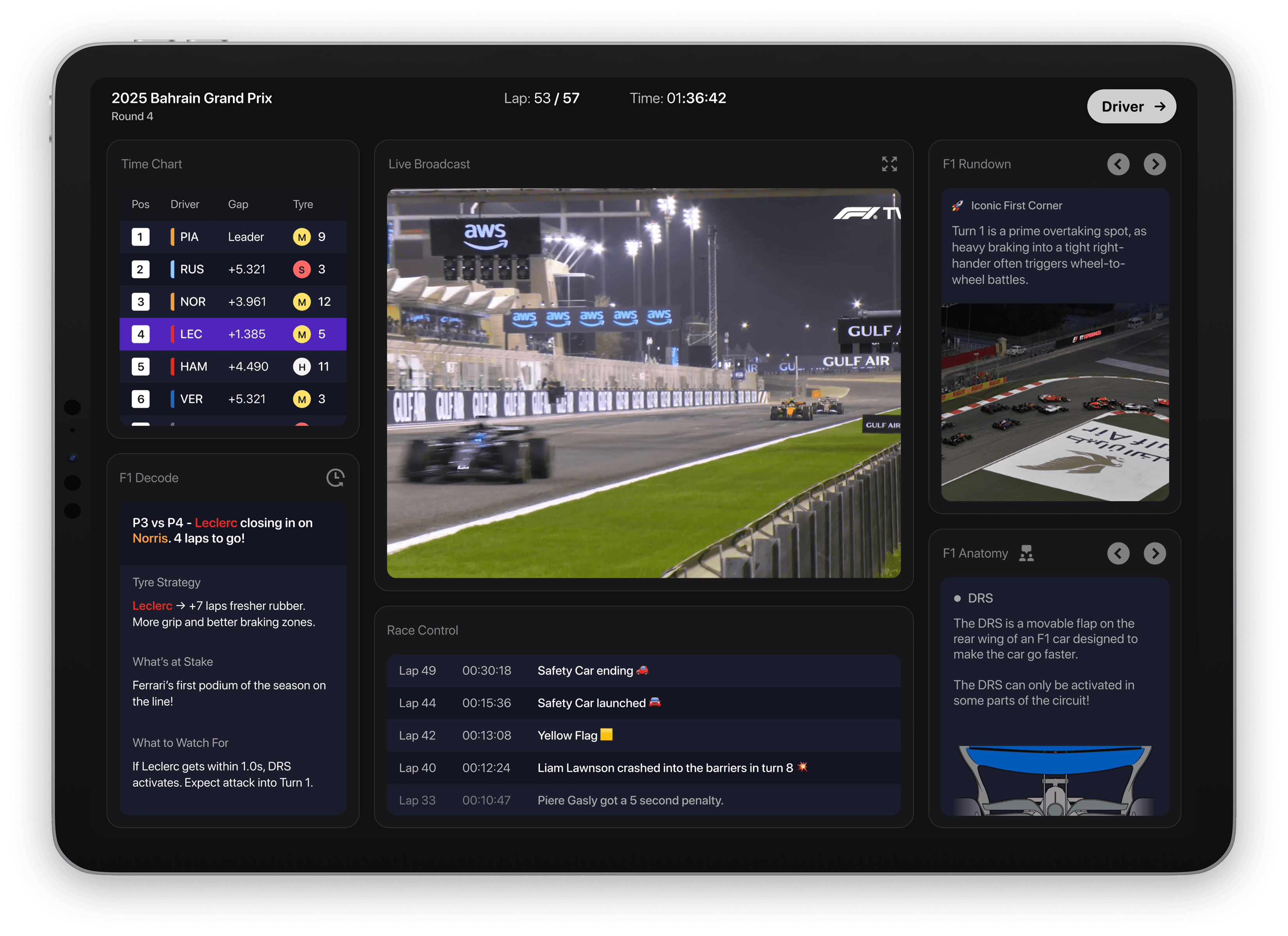 Designed a 0-to-1 second-screen system that translates live Formula 1 race data for novice fans