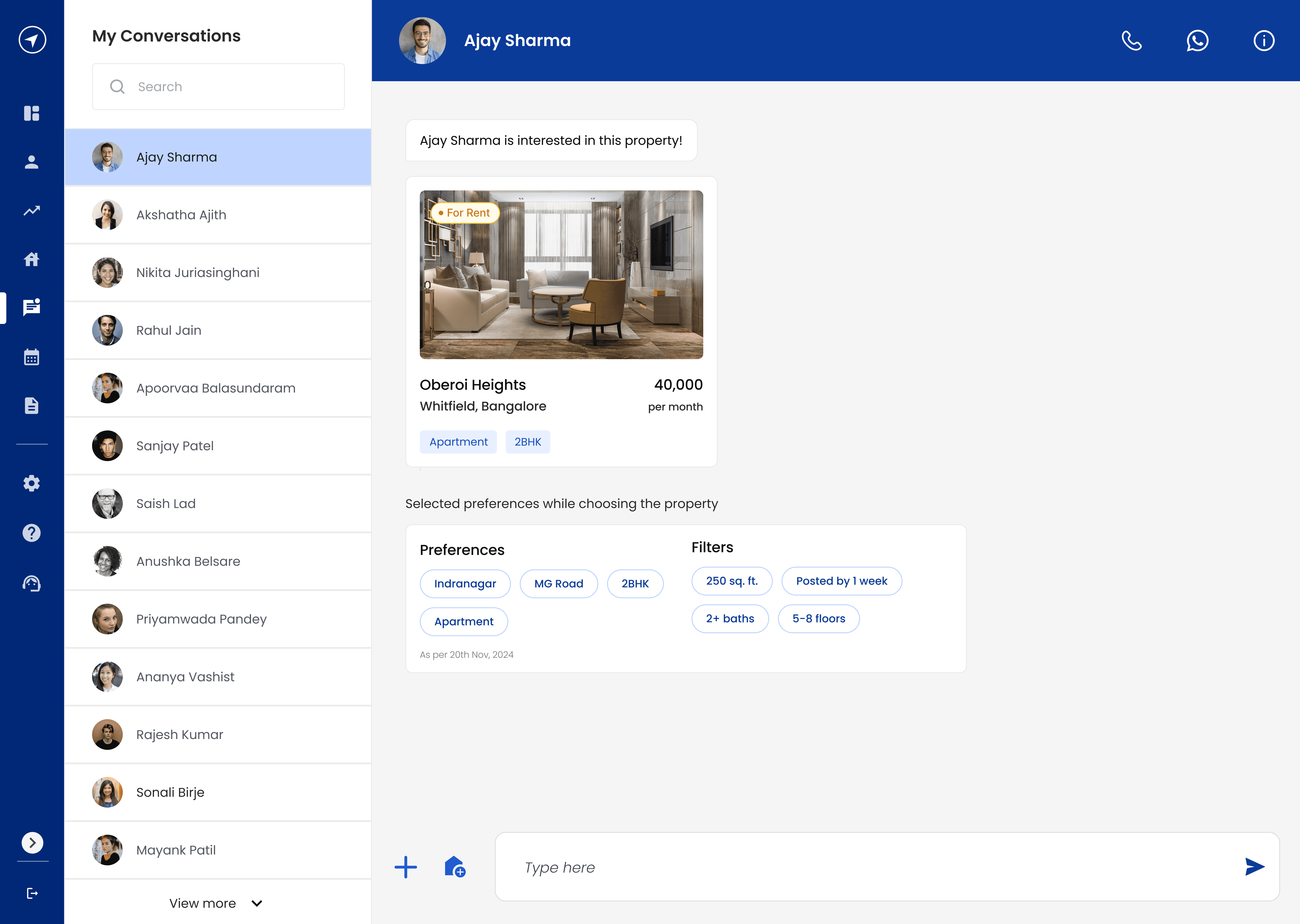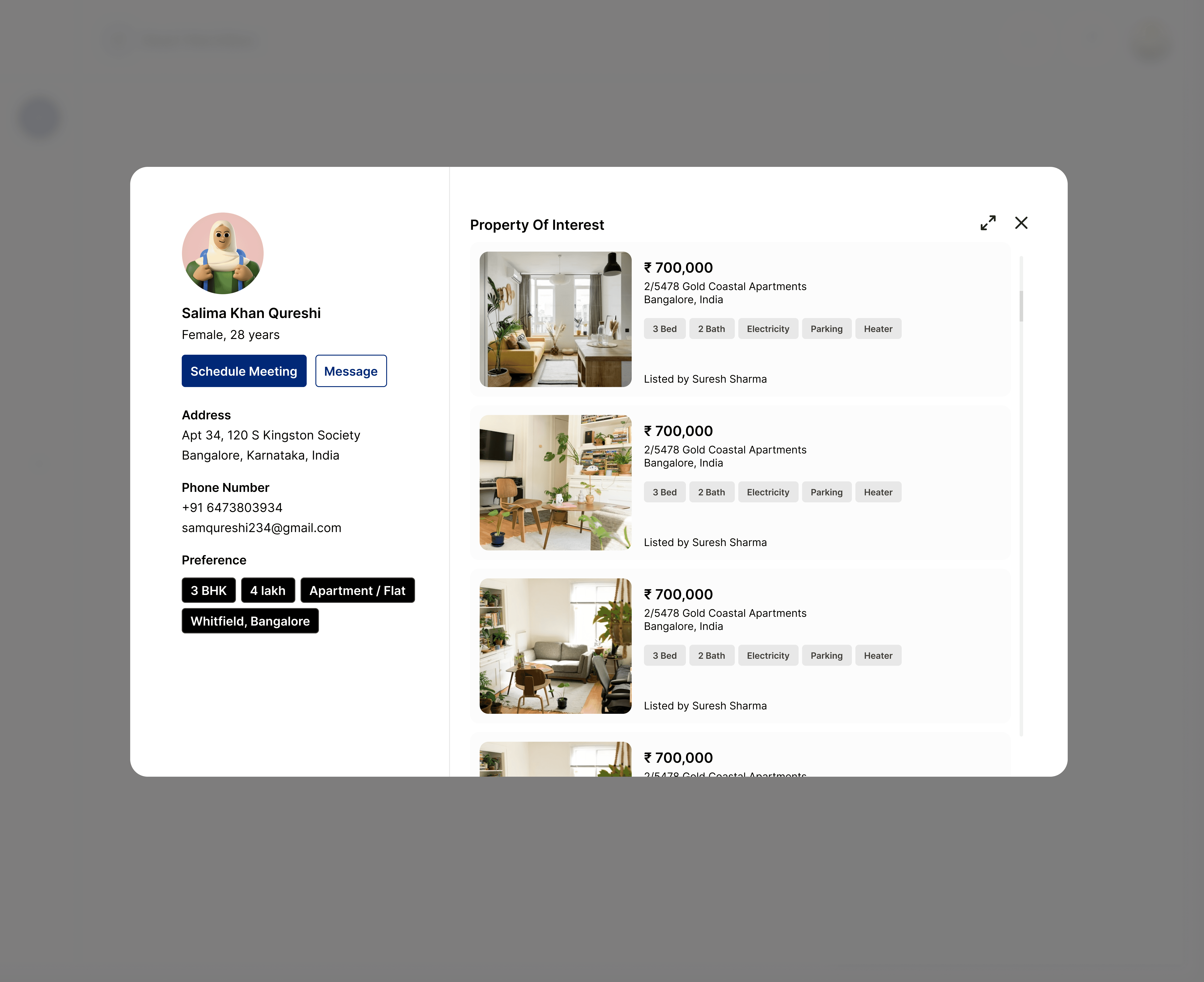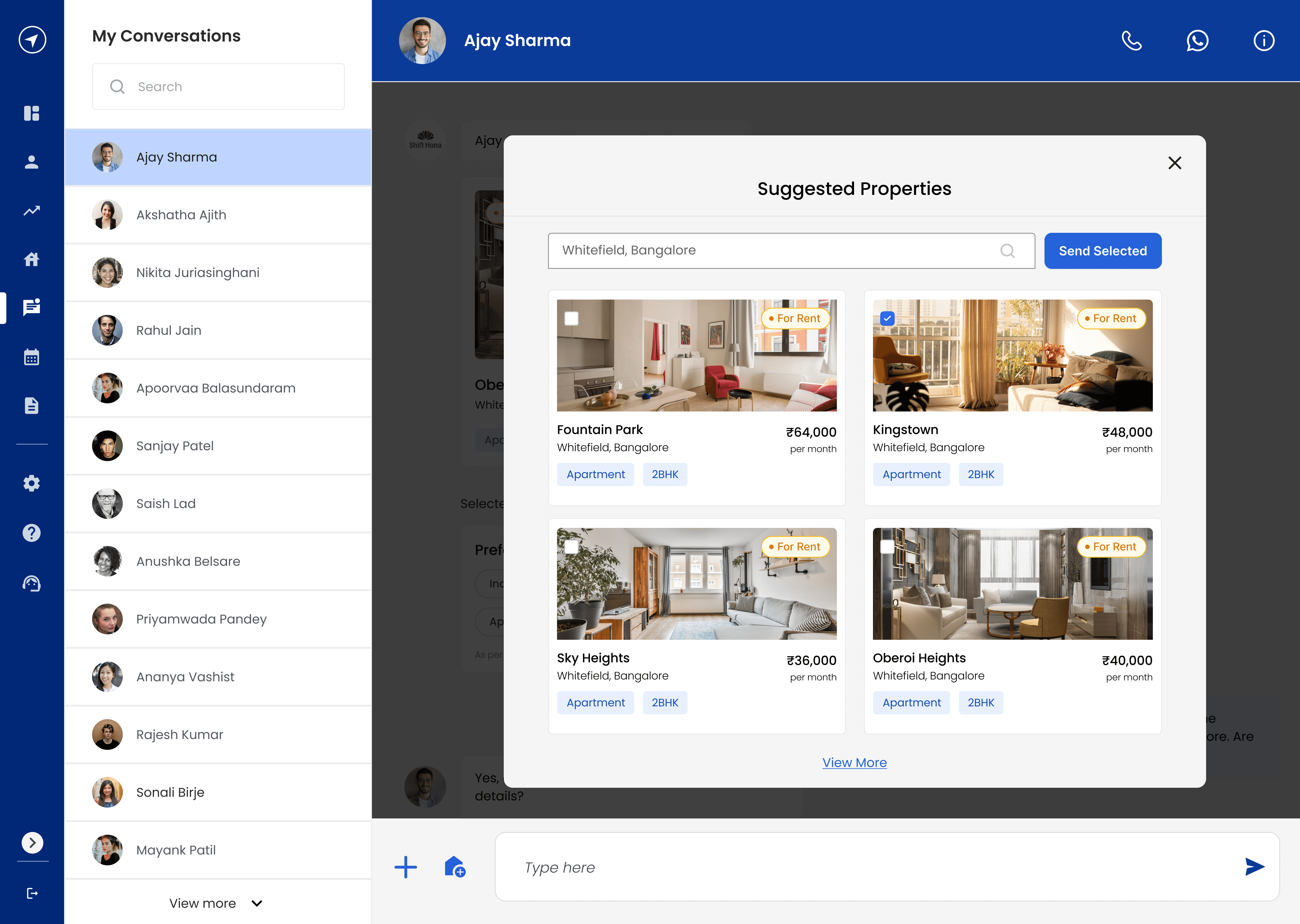 Brokers juggled WhatsApp, calls, and emails to share listings with clients. We designed a communication screen that centralized these interactions—making it easy to message, track liked properties, and share listings directly from the database.